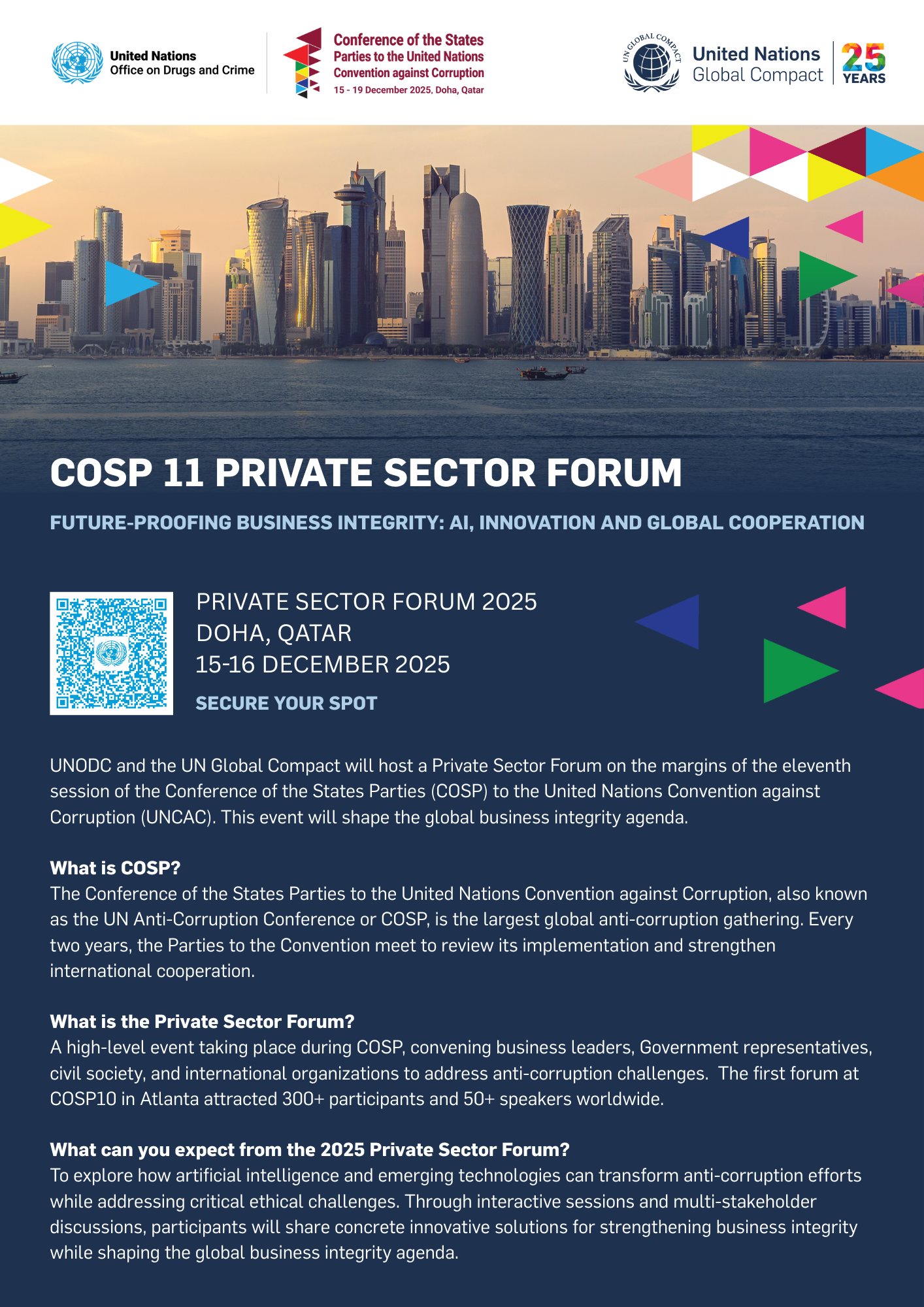 UNODC and the UN Global Compact jointly organize the Private Sector Forum, a high-level event taking place during COSP, bringing together business leaders, government representatives, civil society, academia, youth and international organizations to address pressing anti-corruption challenges. Building on the success of the first Forum at COSP10 in Atlanta, which attracted approximately 300 participants and 59 speakers from major companies and organizations worldwide, the COSP11 Private Sector Forum will create a space for meaningful dialogue and commitment to strengthen business integrity. The Private Sector Forum will take place on 15-16 December 2025, in Doha, Qatar.